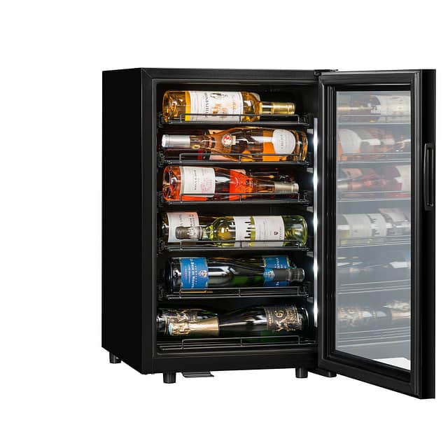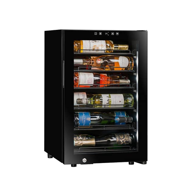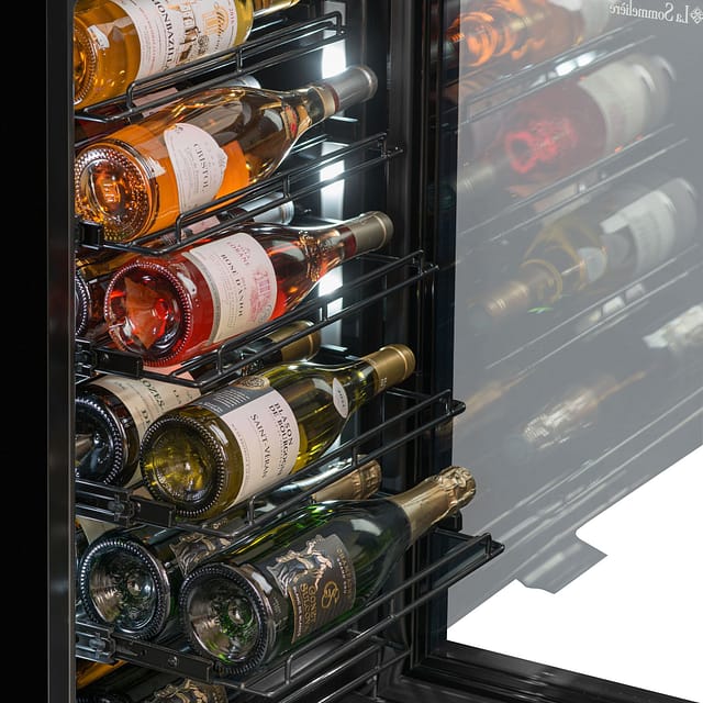 Vinkylen säkerställer stabilitet och optimal smaktemperatur så att du kan njuta av vinets fulla arom. Önskad temperatur kan ställas in med den digitala kontrollpanelen som sitter på utsidan av vinkylen. Placera dina viner i de praktiska och utdragbara trådhyllorna som är anpassade till vanliga 75 cl vinflaskor av Bordeaux-typ. Dessutom är dessa hyllor flyttbara, så att du kan anpassa förvaringsutrymmet efter dina specifika behov.