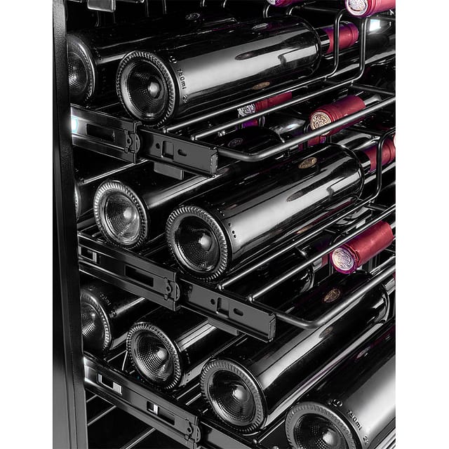 De specialdesignade ”label-view”-hyllorna visar upp flaskorna på ett snyggt och tydligt sätt med etiketten ut mot glasdörren. De solida stålhyllorna är teleskopiska och kan dras hela vägen ut, vilket gör det enkelt att hitta rätt flaska.