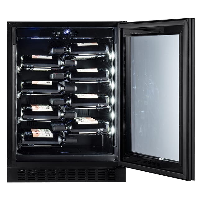Copenhagen-serien har en snygg och läcker design. Välj mellan rostfri front med handtag eller svart glasdörr med integrerat handtag i dörren. Vit LED-belysning längs sidorna lyser upp din vinsamling på ett snyggt sätt.